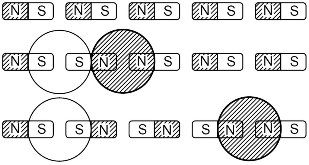 現在想像許多磁鐵棒排一列,每個N極漆成紅色,S極漆成藍色。若你站遠再模糊視線,只會看到一整片紫色。要是把一根磁棒倒轉,就會有一處是兩紅兩藍相鄰,由於面積較大,遠看起來仍顯出紅與藍色。一開始兩區域相鄰,但若你依序翻轉下一根、下下一根磁棒,兩紅區域就和兩藍區域漸行漸遠了。翻轉磁鐵,就能使N極集中的區域和S極集中的區域獨立移動〔圖23〕。磁極被離合了!