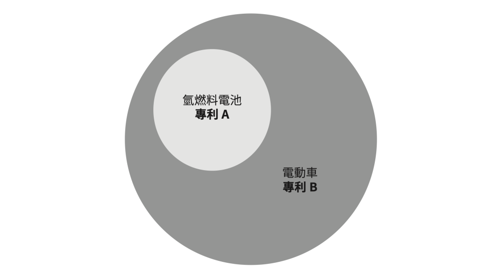 在這個案例中,雖然發明人B另行取得了專利,但他的技術不可避免地使用到A的專利內容。就專利權的範圍而言,B的專利包含了專利A的技術,專利B的權利範圍與專利A部分重疊(圖二)。因此當專利B打算商業化電動車時,需取得發明人A的授權,否則仍有侵權的可能。