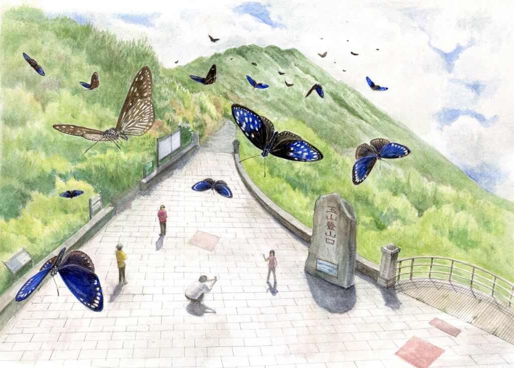 在紫斑蝶的蝶道之下,觀光客若能抬頭,就能領略地形造就的生態美景。這幅圖展現的是蝴蝶、設施與遊客造就的觀光地景。