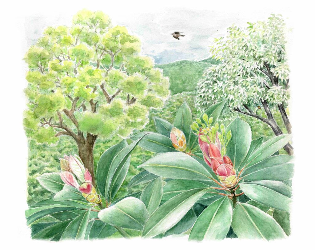 樹葉表面帶著反光的蠟質,以及春季才綻放的休眠芽,是東亞亞常綠關葉林的特徴。這幅圖透過植物生態,暗示了區域氣侯與季節。插畫出自《横斷臺灣》一書。