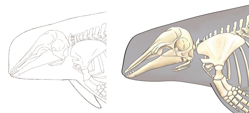 圖三|花紋海豚的骨骼示意圖,左邊的草圖少了顴骨,你發現了嗎?兩張圖還有哪些差異呢?