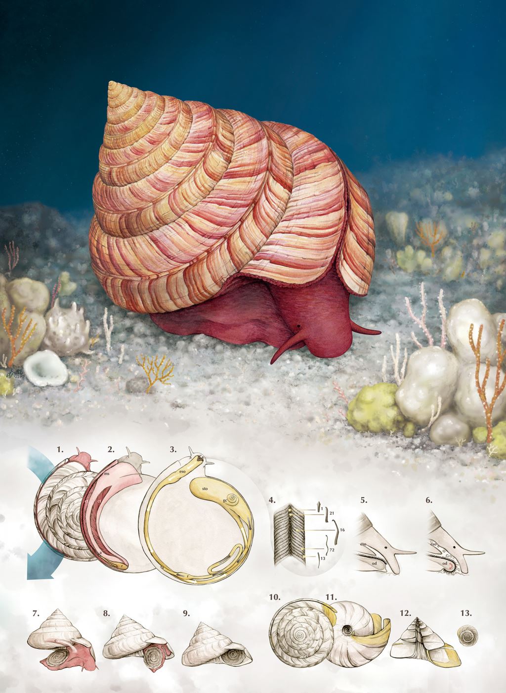 若要進一步呈現生態情境,則需讓讀者身歷其境,因此除了仔細描繪主角的特徵與行為,也必須安排合理的背景和周遭的生物,但切忌喧賓奪主。龍宮翁戎螺棲息在大約 100~400 公尺的深海,以海綿為食。因此我從深海探測的照片參考海水顏色和海床環境,並在螺的周遭畫了深海珊瑚與海綿,但刻意畫得比較朦朧黯淡,左右交錯漸漸遠去,讓畫面的視覺焦點維持在螺身上。如果是輕鬆的兒童刊物或科普書籍,就可以用更活潑的筆法和色調增加閱讀樂趣,但畫圖的過程仍然需要考據資料。