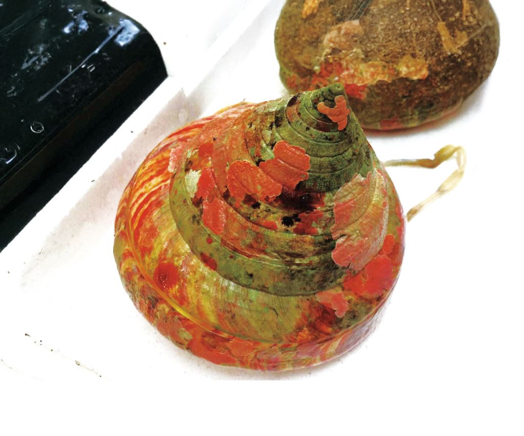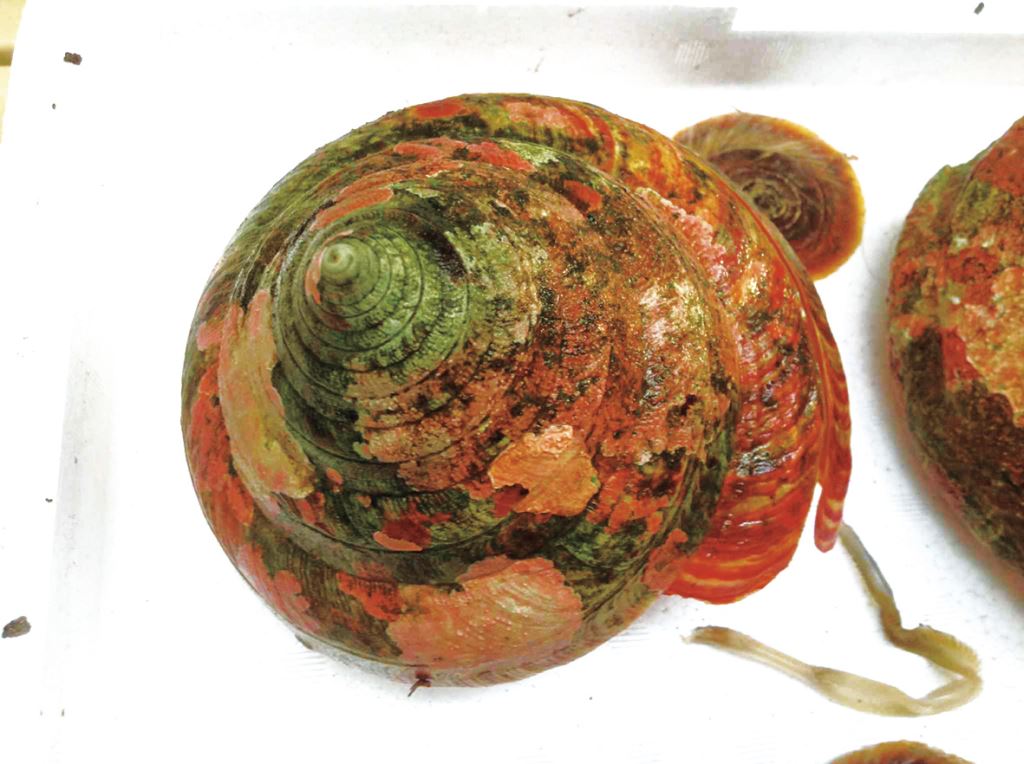 )棲息於深海,活體的影像紀錄屈指可數。我檢視了國立臺灣博物館的貝殼標本,查閱研究文獻及網路資料,像是日本的深海探測影像,還有各種翁戎螺的軟體形態,盡我所能畫出了牠活著的樣子。幾年後偶然看到新照片,才注意到龍宮翁戎螺活著的時候,貝殼常常有更多藻類附著,可惜當年沒找到這樣的資料(圖二)!
