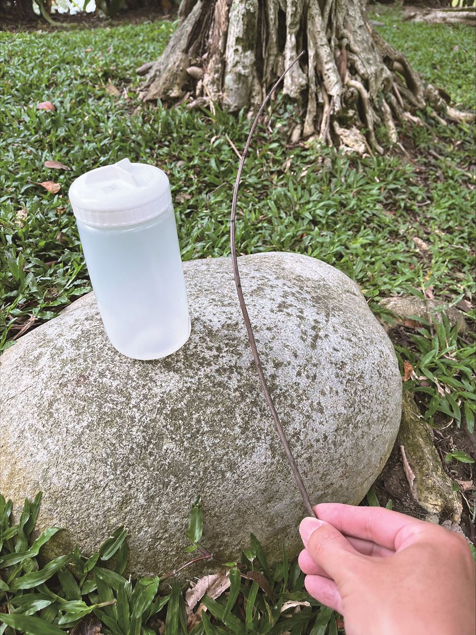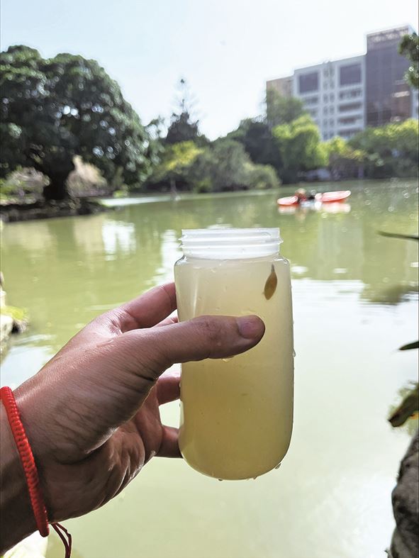 到這裡,我們的「魔法陣」就決定是缺氧、光照、味精(麩胺酸)和魚露了。底下是筆者到中興湖採樣、培養光合細菌的流程,大家可以參考看看。