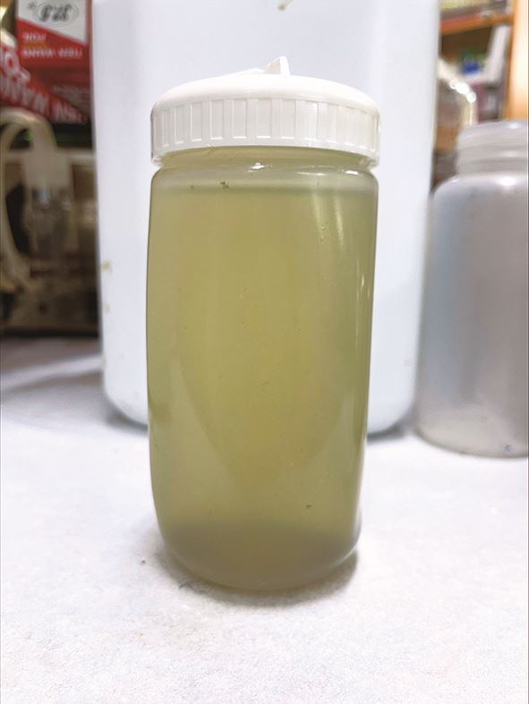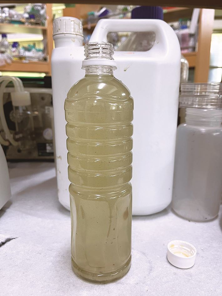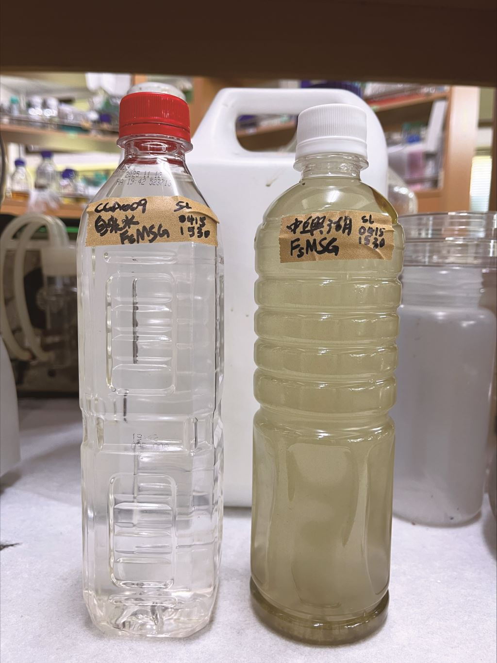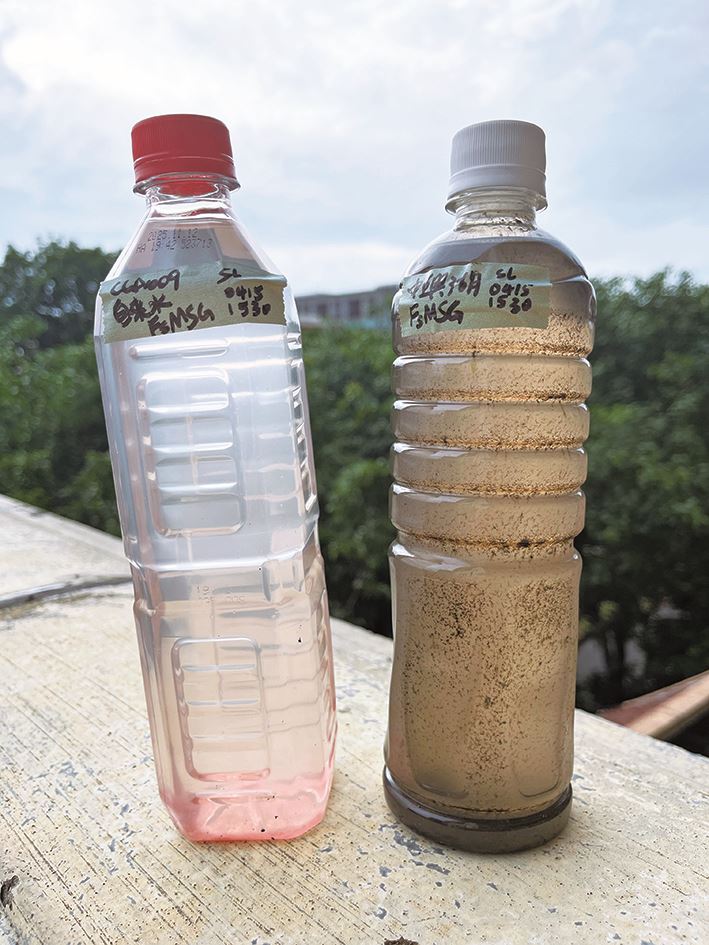 13. 放到室外陰影處靜置一週後,左邊對照組明顯長出紅色的光合菌。