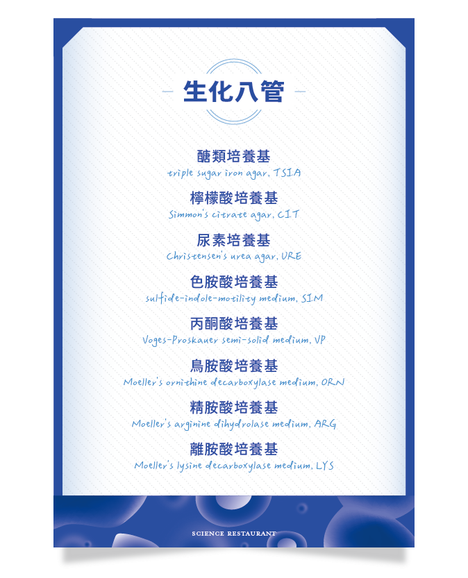 這八管的基本原理,如同我們區別草食、雜食、肉食性動物的方法,是根據細菌「飲食習慣」作分類。它吃什麼糖?吃檸檬酸嗎?尿素咧?離胺酸吃不吃?你可能會拋出諸如此類的問題。表一簡單列舉生化八管的「餐點」內容。