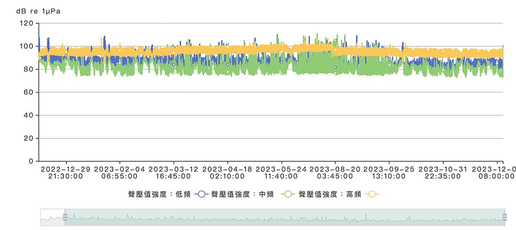 圖三|此圖示範透過LTSER 綠島站平臺,能取得2022∼2023 年的珊瑚礁水下聲景分析圖。(長期社會生態核心觀測– 綠島站)