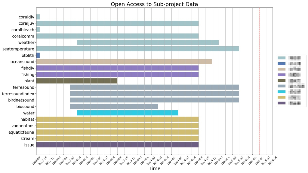 以綠島站為例,團隊資料管理員運用 Google Colab 建立並維護資料清理的腳本(script),並透過研究資料寄存所(depositar)的應用程式介面(application programming interface, API),讓資料從清理、上傳、管理分享都能與日常研究工作緊密結合。透過這些腳本,團隊就能即時檢視資料集內容、追蹤上傳進度與筆數,並將結果視覺化為甘特圖(Gantt chart),可用於報告與進度追蹤(圖四)。這樣的流程不僅節省時間,也確保所有團隊成員得以看到最新成果。