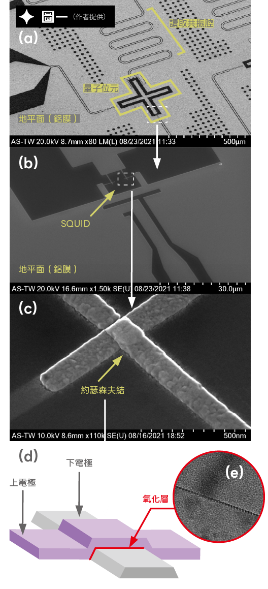 (a)超導量子晶片製作在矽晶片上的全鋁製超導量子晶片,含有十字形量子位元。(b)十字形電容下端的 SQUID,SQUID由兩顆並聯的約瑟夫森結組成。(c)( d)約瑟夫森結的電子顯微鏡相片及示意圖。(e)氧化層的穿隧電子顯微鏡相片。