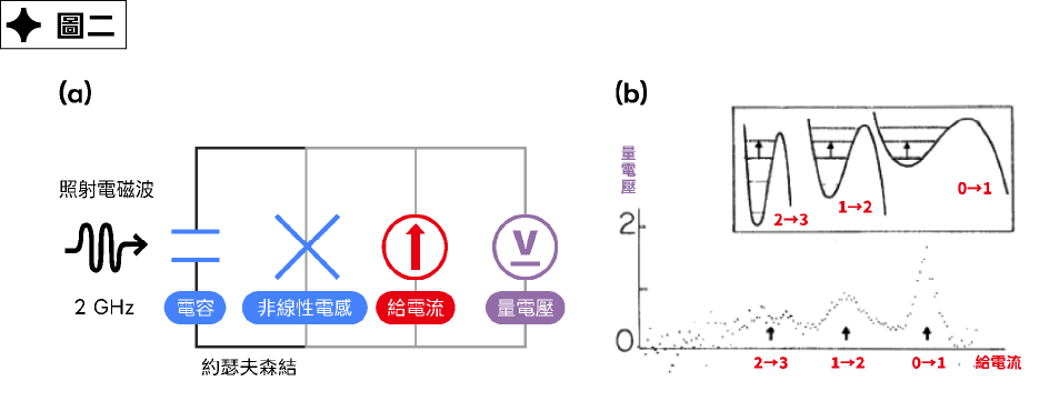 但究竟該如何驗證這些能階離散的特性呢?方法其實與科學家用光譜量測氫原子能階的方法類似:當約瑟夫森結被加一個小於臨界電流的電流時,並以微波照射,就會產生量子躍遷,也就是約瑟夫森結離開零電壓的狀態,而科學家也在約瑟夫森結中觀測到電壓訊號(圖二)。這樣的結果便說明了約瑟夫森結確實具有清楚、可觀測且離散的量子能階,從而證明「大量電子凝聚而成的宏觀系統也能展現出量子現象」。而這大量電子凝聚而成的宏觀系統讓物理學家將約瑟夫森結稱為「人造原子」,這項發現不僅在科學上具有深遠意義,也為技術應用開啟大門,並為後續量子技術(例如超導量子電腦)提供了物理基礎。