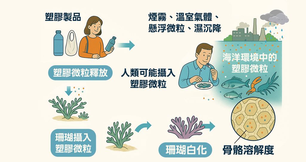 .塑膠微粒會被海洋生物攝取,並進入食物鏈,最終威脅人類的健康。而珊瑚不僅會因誤食而受損,還可能產生鈣化作用,危及珊瑚礁生態系的完整性與多樣性。