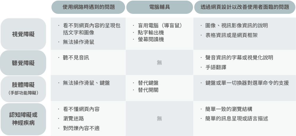 .無障礙網頁主要針對視覺障礙、聽覺障礙、肢體障礙、認知障礙設計。依據各個身心障礙者所需要的資訊如點字機、手語翻譯、替代鍵盤等來搭配設計。