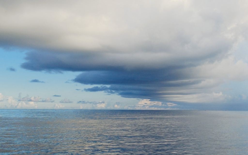 午後離港,山嶺堆積的烏雲瀰漫西半邊天際,東邊海上陽光依然炫麗,是夏日午後東部特有的「半邊型天氣型態」──半邊陰霾,半邊充滿希望。