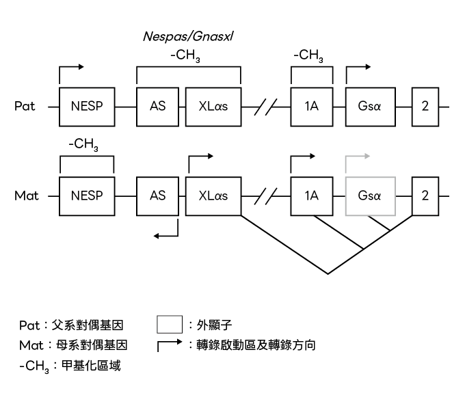父系和母系中鳥嘌呤核苷酸結合蛋白(G 蛋白)基因差異性,導致基因甲基化、基因表達位置不同。(作者提供)