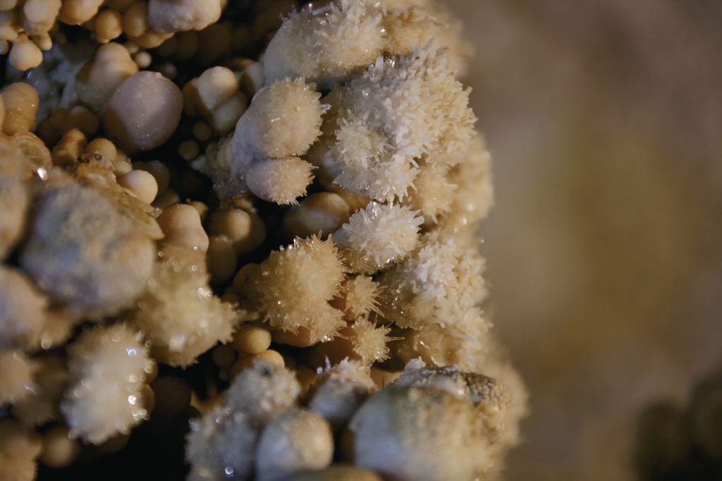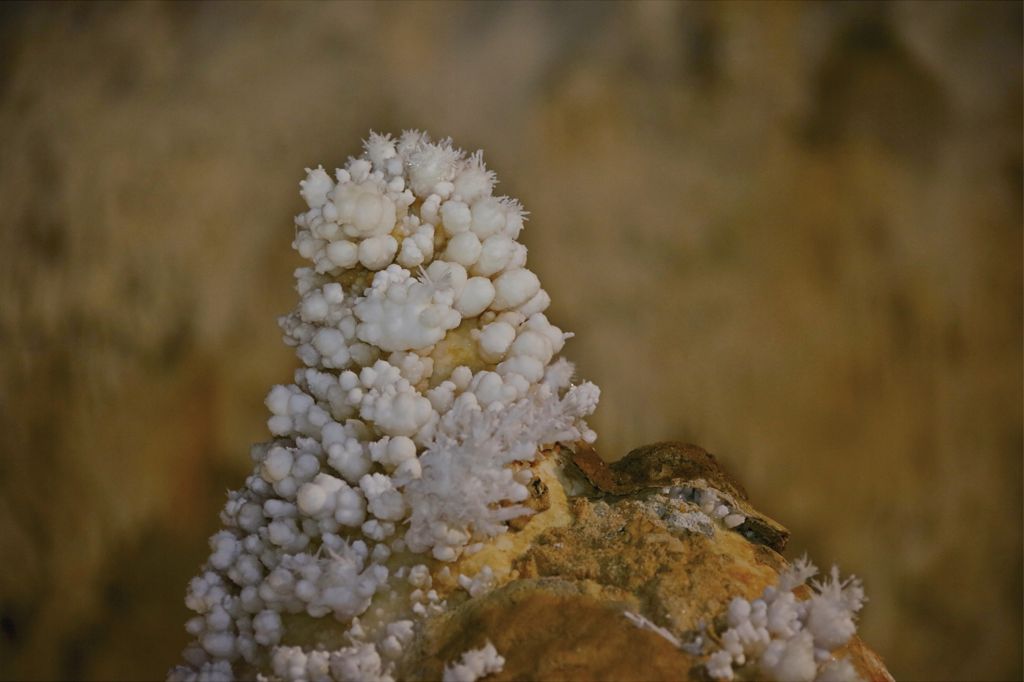 圖一|洞穴鐘乳石是科學家常用於研究古環境與古氣候的重要材料,也非常適合利用鈾釷定年法進行精確的年代測定。圖中顯示的是鐘乳石表面特殊的石花結構,這類結構通常形成於地下水以極薄水膜緩慢流動,並在快速釋放二氧化碳的環境中,使碳酸鈣在高度過飽和狀態下迅速結晶,進而長成如冰晶或霜花般的形態。(作者提供)