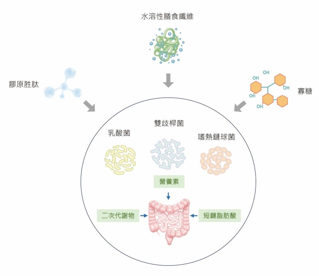 圖一、益生菌配方與代謝轉化機制。膠原胜肽、水溶性膳食纖維與寡糖進入腸道後,成為益生菌的營養來源。乳酸菌、雙歧桿菌與嗜熱鏈球菌透過發酵與代謝,產生二次代謝物與短鏈脂肪酸,共同調節腸道環境,強化腸道功能。