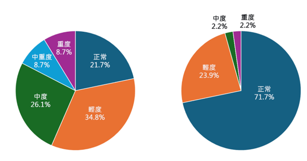 試驗結果顯示,全部受試者在試驗前分級,正常10人,比例為21.7%、輕度16人,比例為34.8%、中度12人,比例為26.1%、中重度4人,比例為8.7%、重度4人,比例為8.7% (圖二,左);受試者試驗後分級,正常33人,比例為71.7%、輕度11人,比例為23.9%、中度1人,比例為2.2%、中重度0人,比例為0%、重度1人,比例為2.2% (圖二,右)。使用配方 3 週後,「正常」大幅增加、中重度以上幾乎消失,整體腸道分級轉向部分輕度與大多數正常。