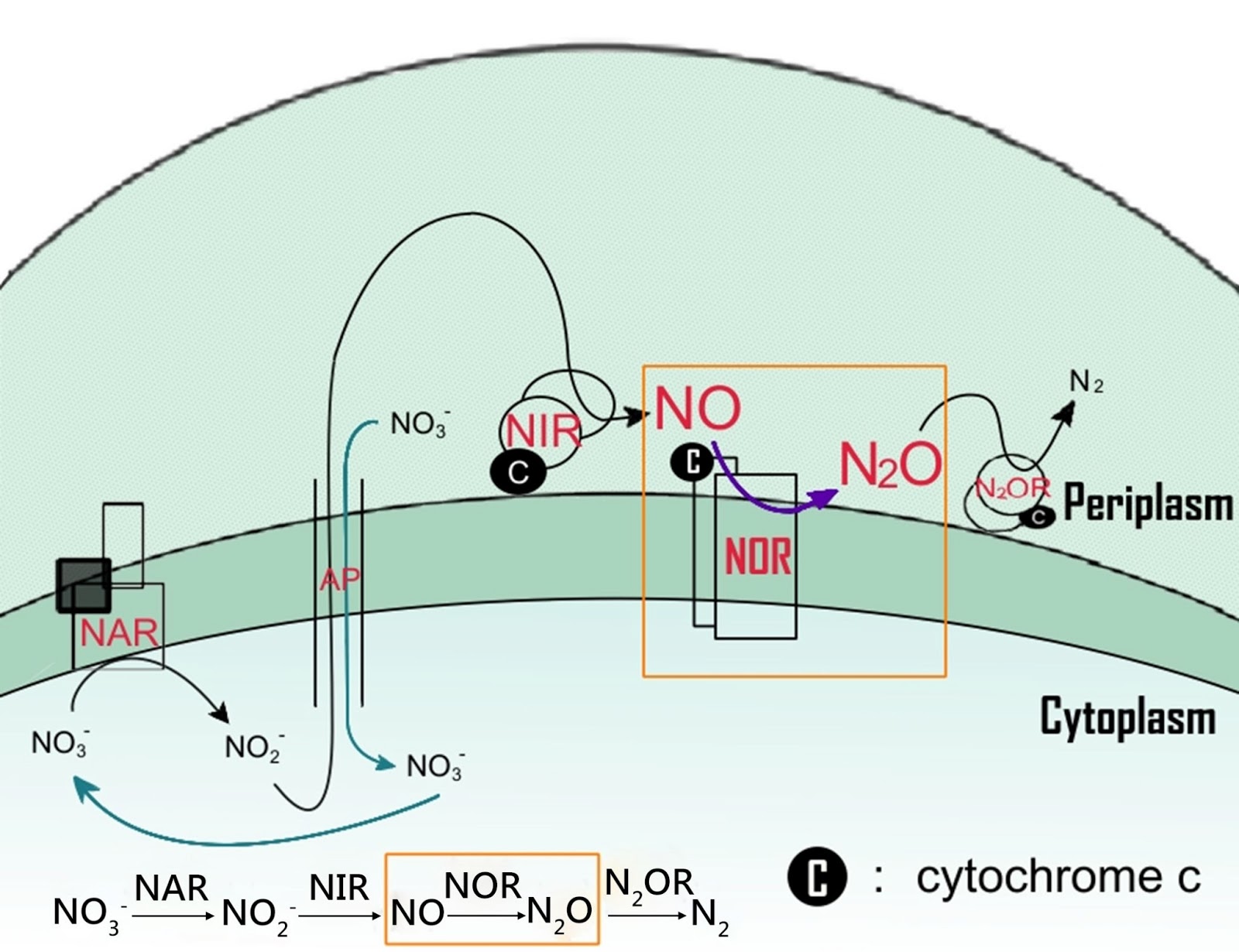 在cNOR酵素催化NO產生N2O的還原過程中(式一),細胞色素C(cytochrome c)提供電子(electron donor),經由催化,將反應物NO 中的氮從正二價還原成正一價形成N2O。