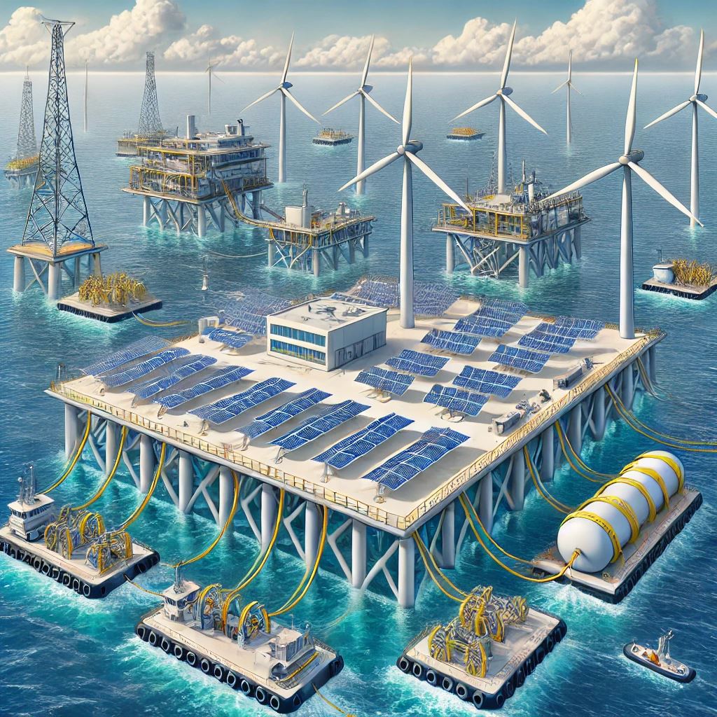 浮動式波浪、太陽和風力的複合式海域能發電並直接就地電解製氫的示意圖。(由作者使用 ChatGPT 生成)